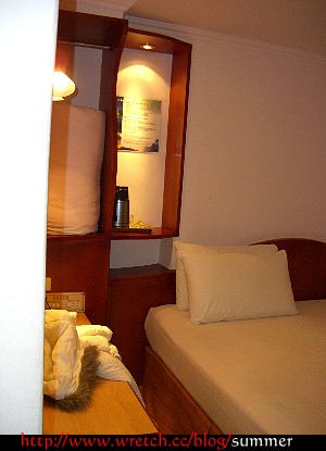 離開了錮魚的棲息地後,緊接著就是要到飯店去Check in,又過了一個多小時的山路車程,這趟車程實在是很怕暈車,在車上製造起酸辣湯了,已經在行前以及行中,吞了兩顆暈車藥,也許是暈車藥的作祟,在車上一直處於昏迷狀態=..=不過到了終點站後,下了車,吸了一下冰冷的空氣,身心舒暢,雖然空氣冰涼,不過沒有風,其實冷對於我來說,沒有很大的威脅性,領隊發了房間的鑰匙,就帶著我們步行到飯店,今晚我們住的地方是阿里山上的高山青大飯店,說是大飯店,實在是有點牽強,開門進去還有點傻眼,因為整個空間就只有這樣...一張雙人床加上1台電視機,以及小小櫃子兼梳妝台,還好還有浴室...更重要的有熱水就好ㄒㄒ