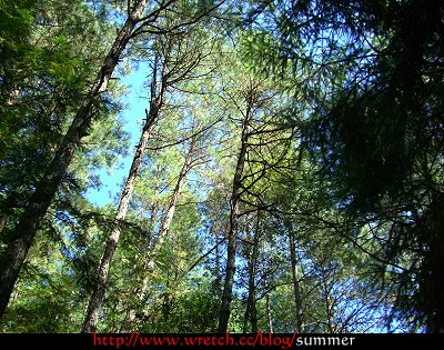 ㄧ路上都是這樣的風景綠色的樹影,透著藍色的天空,陽光透進來,灑下整片的陽光,太陽雖大,但是在林間步行的我們,在林間竄動的芬多精,帶著林間的微風,涼意陣陣,很舒服,很舒服,很舒服