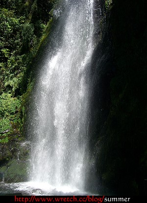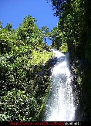 走了差不多4公里左右時,就一直聽到不遠處傳來的潺潺流水聲,以及瀑布宣洩下來的聲音在山谷間迴盪,後來一個轉角就看到了煙聲瀑布,這次來很幸運,水量不小,之前有聽我同事說,上次他們再冬天來的時候,水量非常的小,走了大老遠的路,看到小小的水量滴滴落落的,實在是令他們失望,也許是冬天的原因,乾燥氣候的台中,造成了微小的水量,這次我們來時,看到傾盆宣洩而下的瀑布,暫時讓我們忘記了發麻的雙腳,爬山的疲憊感瞬間跑到九霄雲外去