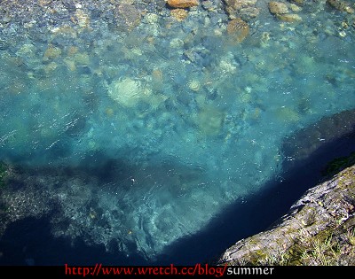 在回程的路上,司機先生帶我們去拜訪櫻花鉤吻鮭,在來桃山的路上時,司機先生就嚷嚷的要帶我們來看,既然都已經來了,ㄧ定要看看這國寶級的保育類動物,司機先生很可愛的說等等他會打電話先預約,跟櫻花鉤吻鮭說我們要去拜訪他,請他們ㄧ定要露面,司機說因為陽光直射角度的關係,所以要看他們ㄧ定要在中午看,看的會比較清楚,等我們爬下山了,也差不多中午了,後來司機就帶我們來到七家灣溪,七家灣溪位於大甲溪上游,海拔約一千五百餘公尺以上,由於水質清澈,水溫均維持在攝氏16度左右,使得七家灣溪成為唯一能孕育櫻花鉤吻鮭的水鄉,更是保護櫻花鉤吻鮭棲息與復育最為重要的地方,七家灣的水質非常的透徹,有著淡淡清澈的藍色,一望就可以見到了底,看到了幾隻櫻花鉤吻鮭在水底悠遊,很興奮,終於見到了傳說中的國寶,司機大哥一再強調,櫻花鉤吻鮭是很龜毛的生物,對於生長環境非常的要求,所以國家公園禁止遊客在溪邊玩水,因為污染的速度非常的快,會使得櫻花鉤吻鮭的覆育難度更加的困難,如果有機會到雪霸國家公園,應該可以在清澈的七家灣溪中見到背部為青綠色的國寶魚櫻花鉤吻鮭。對位處亞熱帶的台灣來說,能有櫻花鉤吻鮭這種冰河時期所遺留的魚類,可說是生物史上的奇蹟,也具有特殊的學術意義。
